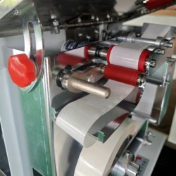 三、標簽粘貼方法。機器自動剝離標簽到達設(shè)定長度后,用手將盒子朝標簽推行,即可自動完成直角粘貼。