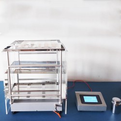 大量程觸摸屏固體密度計(jì)可以測(cè)量密度大于或者小于1g/cm3的固體材料密度,測(cè)量密度小于1g/cm3的固體材料時(shí)需要采用抗浮架,而密度大于1g/cm3的固體材料,在使用水作為測(cè)試介質(zhì)時(shí)無(wú)需使用抗浮架。以測(cè)量密度大于1g/cm3固體材料的密度為例:在儀器0.0g狀態(tài)下,將試樣置于空氣中測(cè)量臺(tái)上,數(shù)值穩(wěn)定后選擇取樣,然后將試樣浸沒(méi)于水中吊籃內(nèi),待數(shù)值穩(wěn)定后,選擇取樣,儀器自動(dòng)計(jì)算并顯示樣品的密度值。